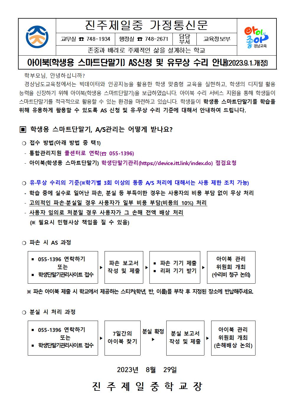 아이북(학생용 스마트단말기) AS신청 및 유무상 수리 안내(2023.9.1개정)