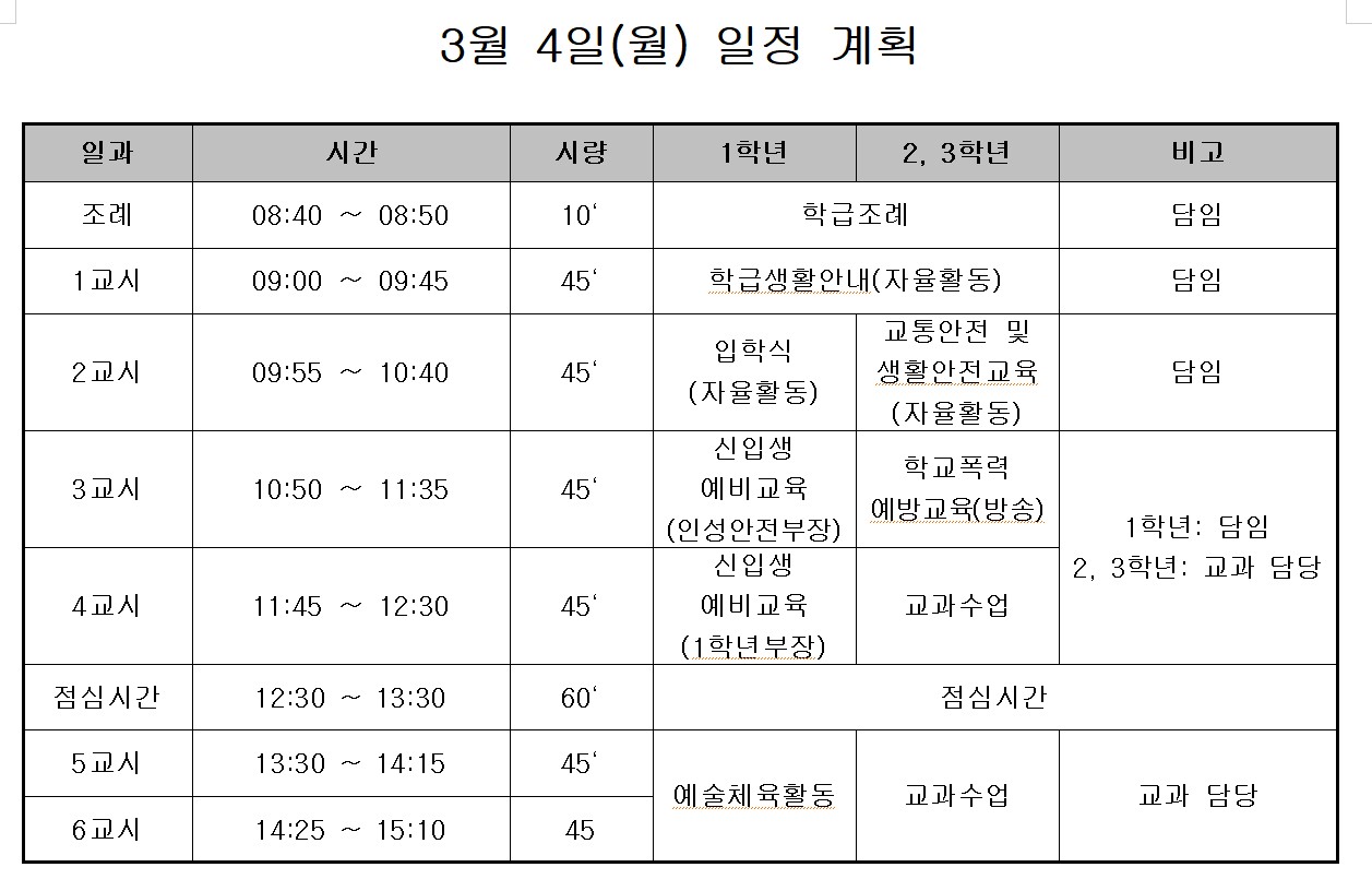 3월 4일(월)~8일(금) 학급별 임시시간표 입니다. 3월 4일(월)은 아래 일정에 맞추어 교과서를 준비하시면 됩니다.