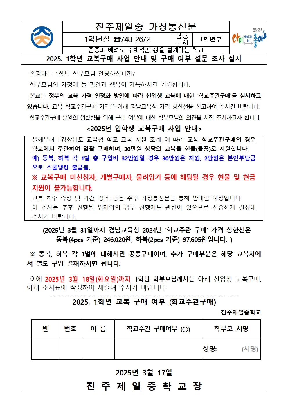 2025학년도 1학년 교복구매 사업 안내 및 구매 여부 설문 조사 실시